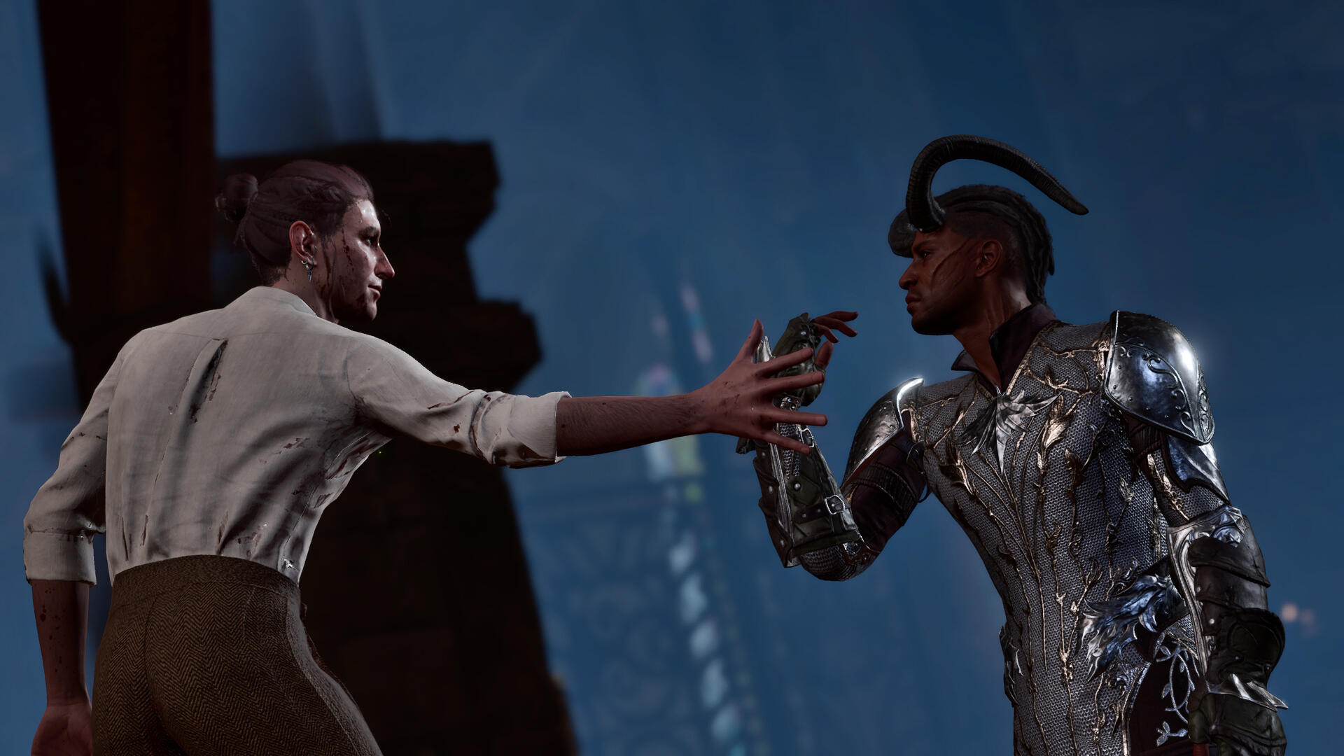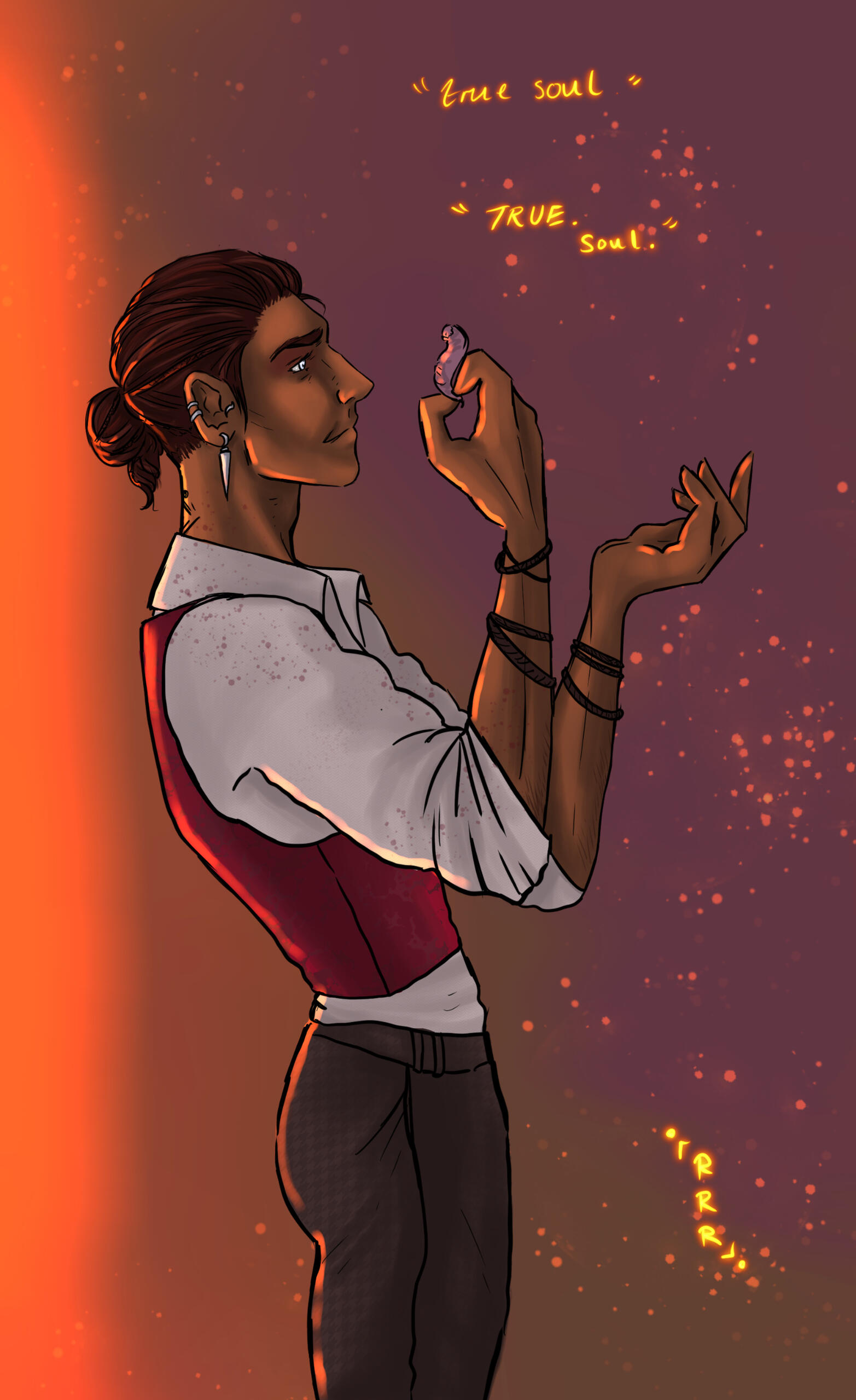 True. Soul.”He casts his clasped fist down.“As if there is any ‘truth’ to a soul robbed of choice,” he spits the words, laced with threading fury.“Their illusion of power, of strength, is no truth.”He looks around you all, and shifts, lifting his chest. You feel yourself lifting too.“Let me show you what it really means. What it means to be a ‘True Soul’.”Augustine twirls his fingers before him once again, and as if plucked from the air itself, suddenly, he is holding something. A tadpole.He holds the wriggling creature aloft between his fingertips. His look as he regards it blistering, his contempt so great you can feel the heat of the air starting to burn.“They forced these things upon us; planted them in our skulls, so they might use us. To control us.”Every word is sharper. Angrier, and you feel his fury. It feels like your own.“Power to the few. Subjugation for the rest.”He watches it squirm.“True. Soul.”He casts the wriggling creature to the floor.He looks down upon it, a sneer curling his lips for only a moment before he clears his face, tilting his chin up - regarding you instead.He holds your gaze. Eyes a blinding light as he brings his foot down upon the tadpole, crushing it under his sole.“Another lie,” he says.He begins to smile. He leaves the smear of the creature on the stone behind him as he takes one step closer.“It is not they who seek the truth,” he says, another step forward.“It must spite them to know their deception has failed,” he says, reaching for you.His hand extended.“For they cannot take me, and they will not take you.”Fingers stretch towards you, his smile growing, and his gaze feels like infinity.“I am the Truth,” he says, “and my search is endless.”