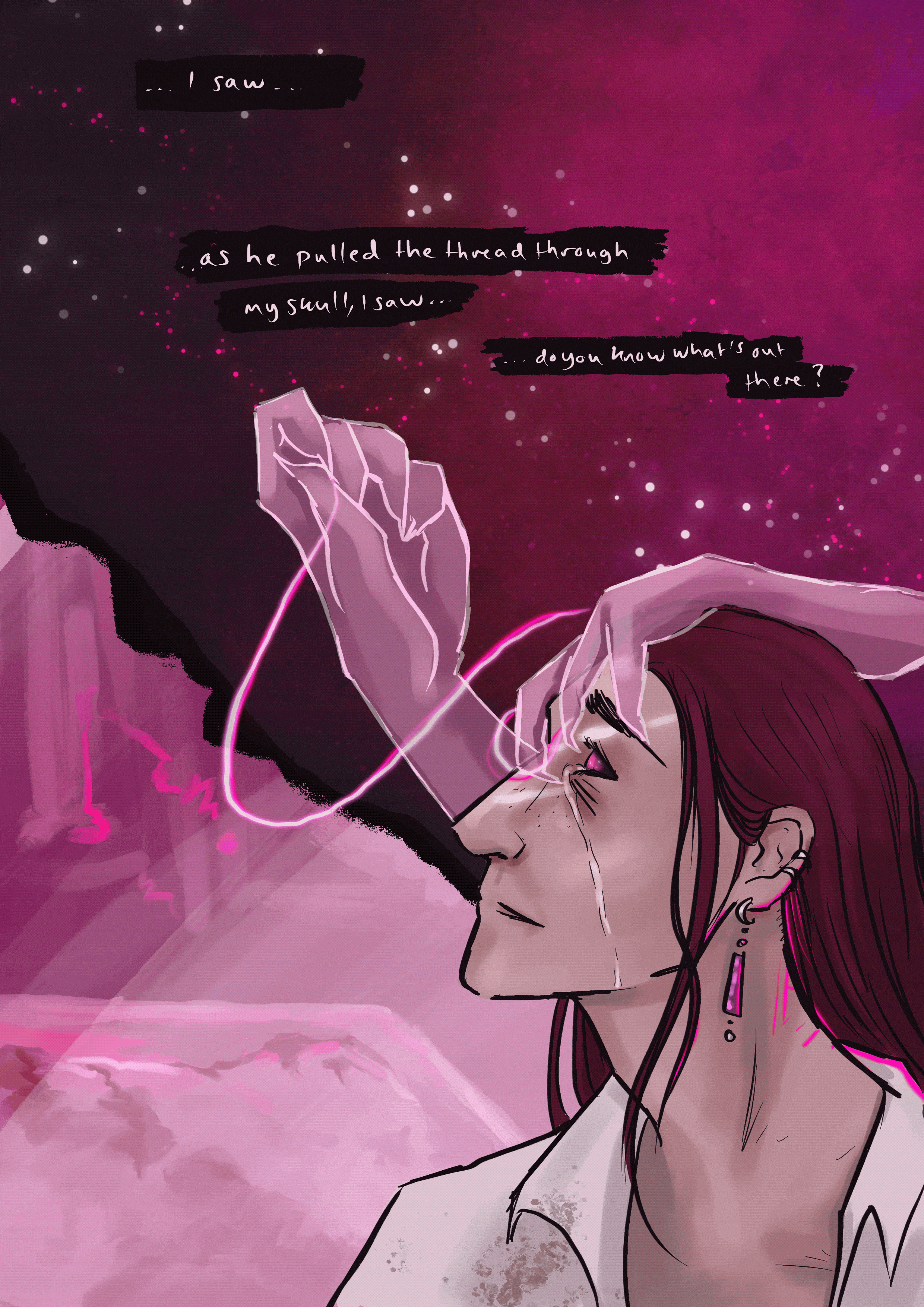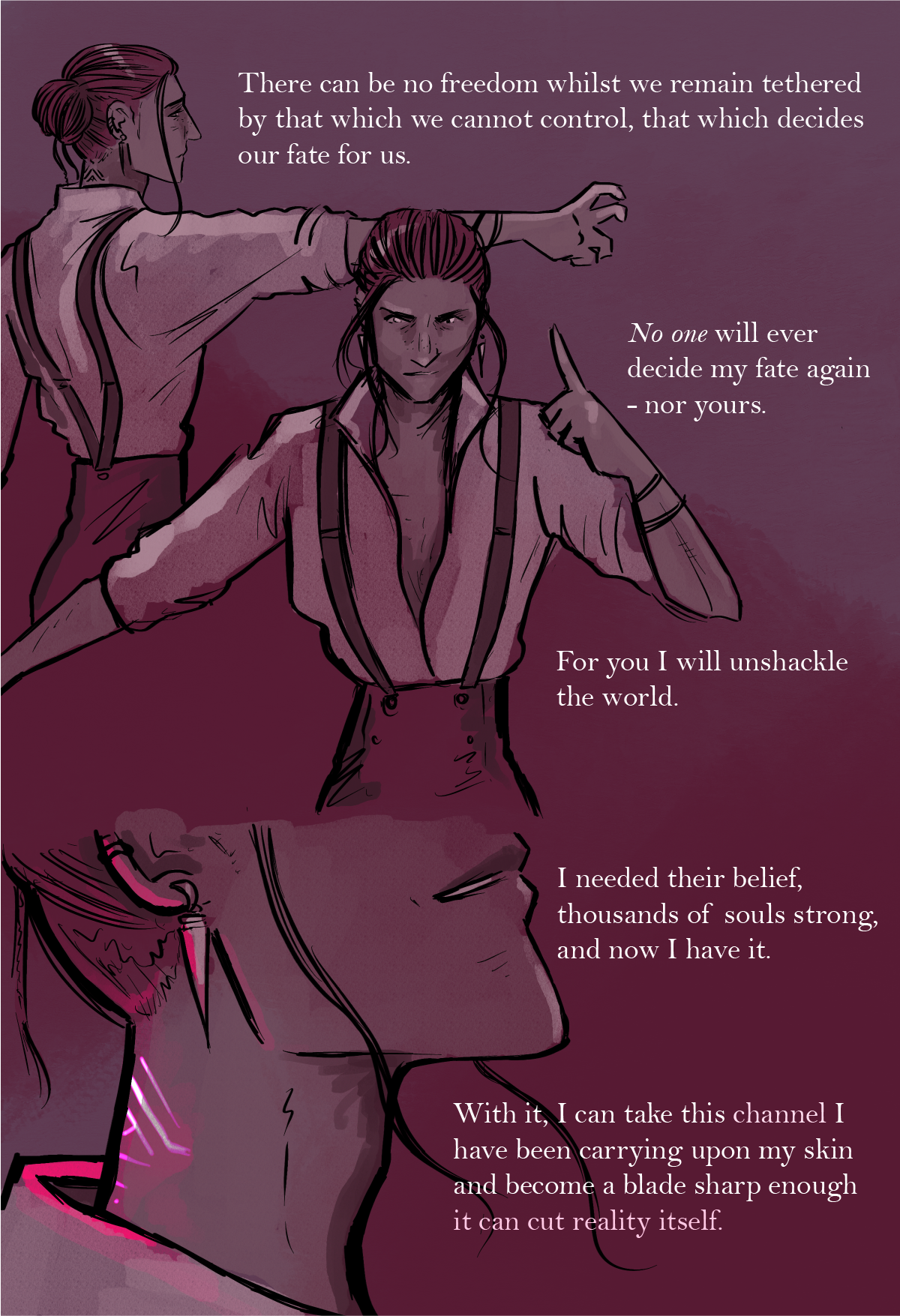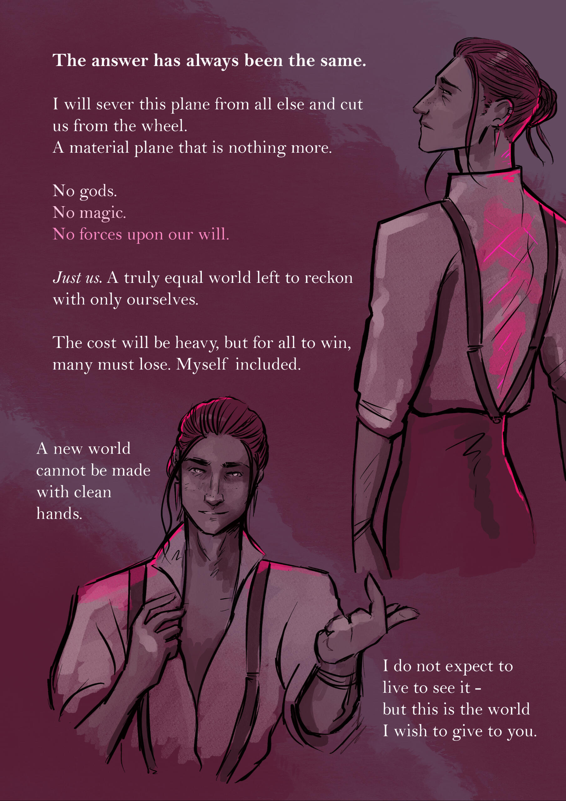 “I’ve always battled with the concept of fate, Boram,” he says, fixing her in his gaze.It’s been unflinching whenever he’s looked at her; he’s met the truth she can’t hide from him with his own, but in this moment, there is more - an unfamiliar expression in there that Boram knows.Doubt.“It’s a thing thrust upon us, handed to us - but I have never believed it had to be. Twice life has offered me a fate, and I have defied it to live. Not luck and chance. I saved myself.”“I might have died in that fire, collateral damage of my father’s sad, miserable life - just another sorry end for another boy born heir to nothing.”“I wasn’t as strong then as I am now; I thought I might die there, but I didn’t.”He gestures now to his back; to the designs that adorn his spine, that Boram knows he’s shared but a fraction of, though she hasn’t told him a word of the design that adorns her own - but they both recognise a mark for a mark.“When Gullistan Horne, that monster - that demon - that thing would have turned me to his weapon - when he scraped my mind from my skull to toy with it - I thought I might die again.”“You don’t know what sort of thing he was,” he said, “although I am sure you’ve encountered your own. Collecting and toying with whatever he chose, plucking their wings like insects, inventing his little tortures to please himself….”“It was my brilliance he was attracted to, he said,” Augustine purses his lips - a cloud crossing his features, dark and heavy, “my ‘fascinating broken brain’ - that it was sweeter to own something so hard to subdue.”“He wanted to make me a vessel. His vessel; a channel, to fill me with rot so I might be his avatar on the material plane. His puppet to do his little evils. Men born with power - they have such weak ambitions - they want such ugly things… you know this more than most, don’t you?”He closes his eyes.“It is my great shame, Boram, that I can’t tell you how I did it. I confess - it is my confession to you - that I don’t know how I broke his hold. I shouldn’t have been able to; but I did.”He opens his eyes, looking instead at his hands.“It’s no easy thing to kill an archfey, but they can die, and he did. I had no weapon. No blade. I killed him with my own hands. Pressed my fingers into his skull until I broke it and broke him.”He takes a breath.“Then I took the mark he’d given me,” he gestures to the symbol between his shoulder blades, “and I made it my own. I could turn his channel to much greater purpose,” he grazes his hand down his spine, “make his petty little ambition into something worthy. If I am to be a weapon it is to be a weapon that can do so much more.”He looks at her, gaze faltering.“When I made it back to this plane it had been over twenty years; my home was gone, my family forgotten as they ought to be, and nothing to return to. So I began the work; the work of gathering as many souls as I would need to create my blade. Heal the sick, bolster the weak, gather my followers on the path to endless truth.”“That is what this is,” he says, “this symbol is my channel - my weapon - through which I will have a blade that can cut through the fabric of reality itself. A blade that could sever our plane from the wheel; and render the material plane free at last, from those influences that would force their fates upon us.”His faltering gaze shakes.“I am walking towards another death Boram,” he says, “and if I stop walking then I will pay the cost for the steps I have already taken… and…”He looks away.“If I save myself this time, what will I become?”