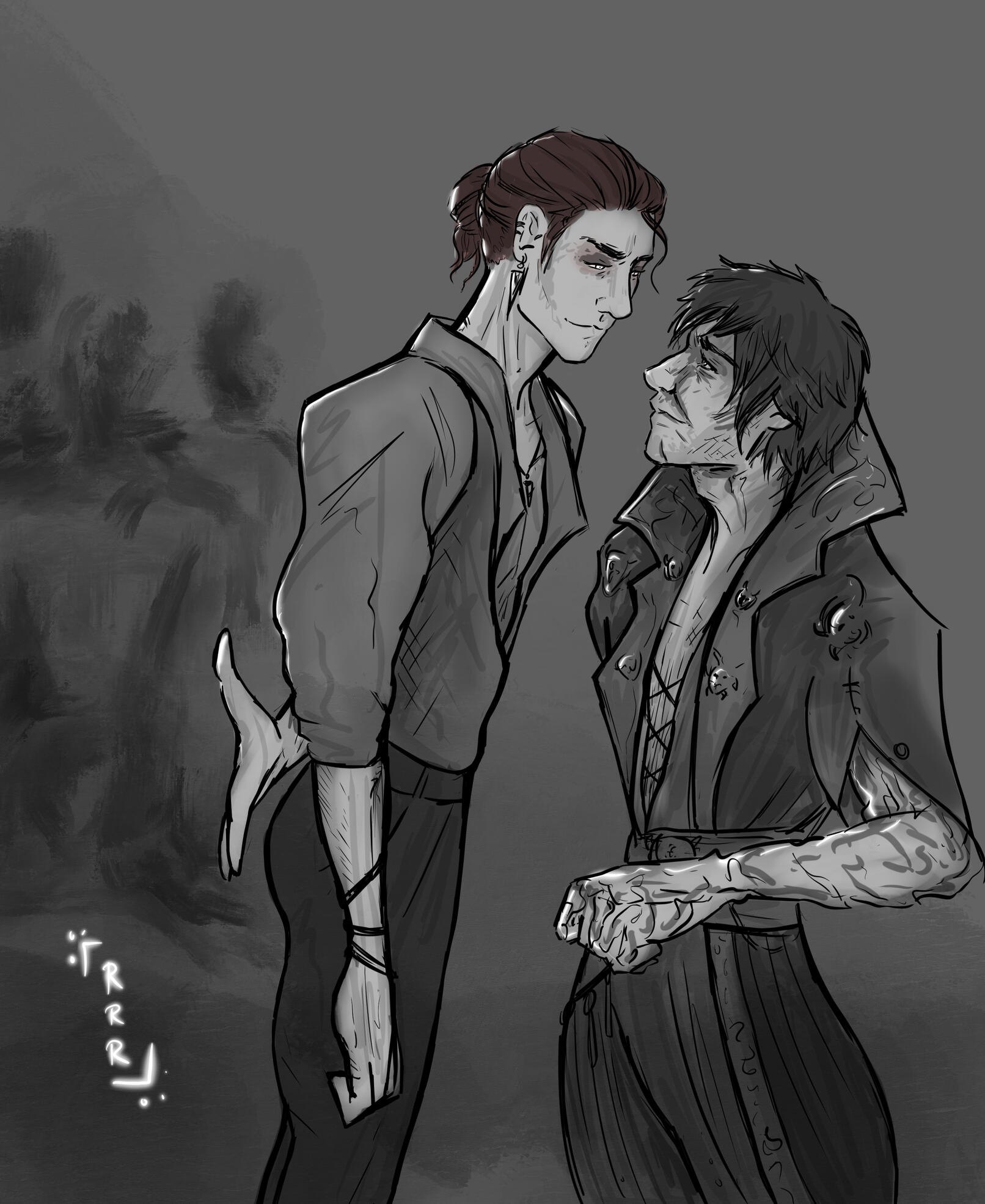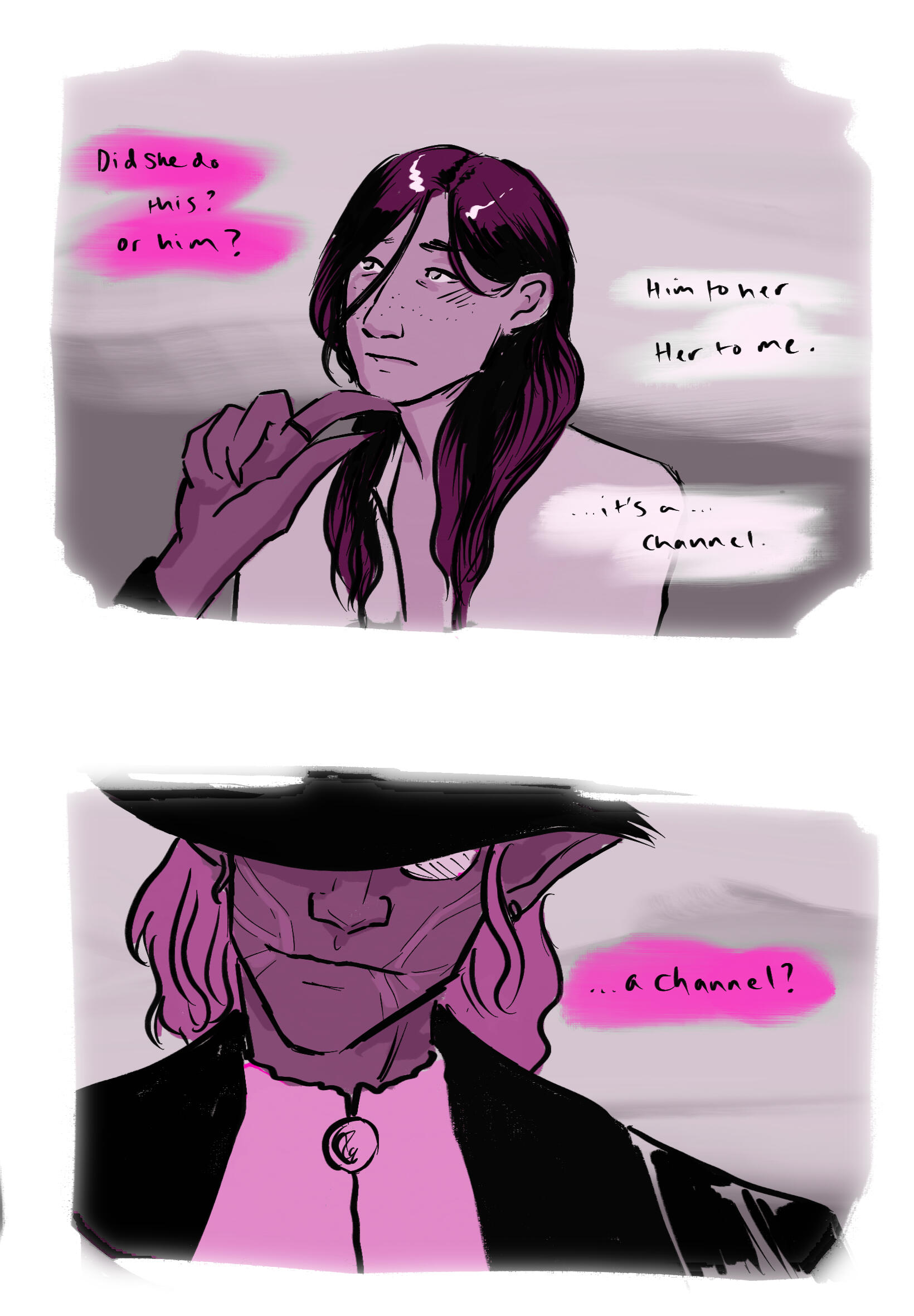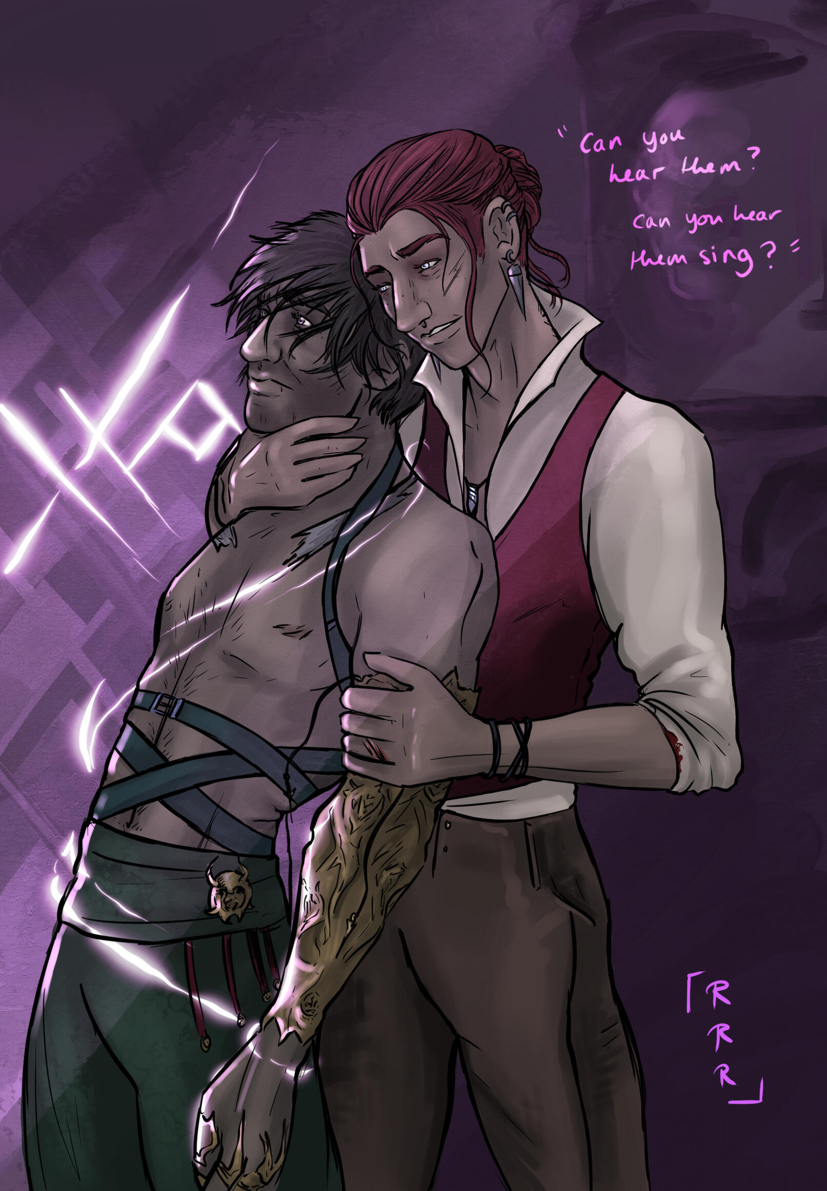 “I’ve always battled with the concept of fate, Boram,” he says, fixing her in his gaze.It’s been unflinching whenever he’s looked at her; he’s met the truth she can’t hide from him with his own, but in this moment, there is more - an unfamiliar expression in there that Boram knows.Doubt.“It’s a thing thrust upon us, handed to us - but I have never believed it had to be. Twice life has offered me a fate, and I have defied it to live. Not luck and chance. I saved myself.”“I might have died in that fire, collateral damage of my father’s sad, miserable life - just another sorry end for another boy born heir to nothing.”“I wasn’t as strong then as I am now; I thought I might die there, but I didn’t.”He gestures now to his back; to the designs that adorn his spine, that Boram knows he’s shared but a fraction of, though she hasn’t told him a word of the design that adorns her own - but they both recognise a mark for a mark.“When Gullistan Horne, that monster - that demon - that thing would have turned me to his weapon - when he scraped my mind from my skull to toy with it - I thought I might die again.”“You don’t know what sort of thing he was,” he said, “although I am sure you’ve encountered your own. Collecting and toying with whatever he chose, plucking their wings like insects, inventing his little tortures to please himself….”“It was my brilliance he was attracted to, he said,” Augustine purses his lips - a cloud crossing his features, dark and heavy, “my ‘fascinating broken brain’ - that it was sweeter to own something so hard to subdue.”“He wanted to make me a vessel. His vessel; a channel, to fill me with rot so I might be his avatar on the material plane. His puppet to do his little evils. Men born with power - they have such weak ambitions - they want such ugly things… you know this more than most, don’t you?”He closes his eyes.“It is my great shame, Boram, that I can’t tell you how I did it. I confess - it is my confession to you - that I don’t know how I broke his hold. I shouldn’t have been able to; but I did.”He opens his eyes, looking instead at his hands.“It’s no easy thing to kill an archfey, but they can die, and he did. I had no weapon. No blade. I killed him with my own hands. Pressed my fingers into his skull until I broke it and broke him.”He takes a breath.“Then I took the mark he’d given me,” he gestures to the symbol between his shoulder blades, “and I made it my own. I could turn his channel to much greater purpose,” he grazes his hand down his spine, “make his petty little ambition into something worthy. If I am to be a weapon it is to be a weapon that can do so much more.”He looks at her, gaze faltering.“When I made it back to this plane it had been over twenty years; my home was gone, my family forgotten as they ought to be, and nothing to return to. So I began the work; the work of gathering as many souls as I would need to create my blade. Heal the sick, bolster the weak, gather my followers on the path to endless truth.”“That is what this is,” he says, “this symbol is my channel - my weapon - through which I will have a blade that can cut through the fabric of reality itself. A blade that could sever our plane from the wheel; and render the material plane free at last, from those influences that would force their fates upon us.”His faltering gaze shakes.“I am walking towards another death Boram,” he says, “and if I stop walking then I will pay the cost for the steps I have already taken… and…”He looks away.“If I save myself this time, what will I become?”