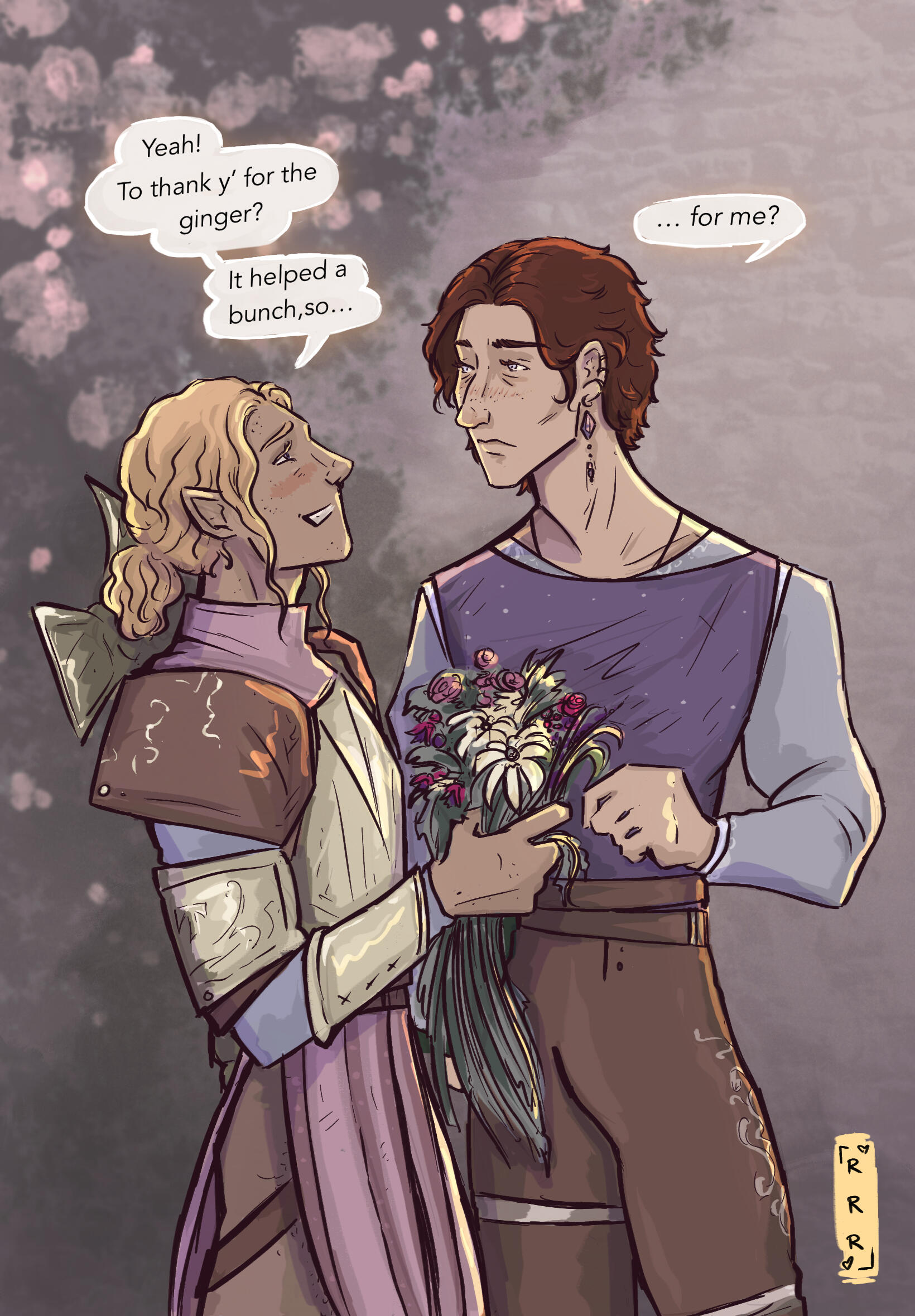 The sign above the door said Allerton’s Apothecary, and as Dominisk pushed inside, they were hit by the scents of must, herbs and something smoky and pungent.The shop was more spacious than it had appeared from outside, the ivy grown front step and shady doorway giving way to a stone walled building with high ceilings - large, high windows casting the fresh morning light amongst tall shelves - some of them housing books, but most of them covered in little drawers and boxes.Quiet, though; for a moment they thought they might be the only person in the store. They drifted in the direction of the wooden desk that was placed parallel to the shelves, where an empty stool suggested there was usually a proprietor.Dominisk clasped their hands together behind their back, braving to venture a little further inside. They weren’t quiet; their plate mail announcing their presence as it always did, but as they caught a glimpse of another figure, they didn’t get the sense they’d disturbed the peace.A tall man stood beside a small stepladder, a paper in one hand, the other opening a little drawer, inspecting its contents - he glanced up at Dominisk, catching their eye for just a second, but barely that.He was dressed nicely, and from this sidelong view, Dominisk noted his crop of dark auburn curls, framing a sharp jaw and a sharp, hawkish nose; the kind of profile they might’ve called ‘dignified’, but he didn’t look old enough to be an apothecary.“A moment,” he called in their direction, and Dominisk nodded, shooting him a big smile.They lingered by the desk, waiting, eyes trailing to a curling wisp of smoke to their left; a little stick was burning away in a pot filled with grains of rice - the source of that smell they hadn’t been able to place - incense.The young man was heading in their direction now, placing a few little glass bottles on the desk and opening a drawer, producing a small muslin sack from within it and scooping them up to tuck them inside. Dominisk watched this, shifting a little on the spot, easing out the ache in their shoulder from where their pauldron had been really digging in the entire ride into town.“Are y’ Allerton?” They asked, smiling still as he seemed to complete his business, straightening up a bit now to look at them.“My employer,” he replied, “If you’ve an appointment with him, he is out attending to engagements, and will not be available for some time. You are of course welcome to wait.”The way he’d said that was a little stilted, like he’d said that a fair few times already, today, but Dominisk shook their head.“Oh, no, that’s ok - I just thought I’d ask ‘cause of the sign, I was hopin’ I could get a little help with somethin’,” they said.Now he was closer, they could get a proper look at him - he really was tall, a head and shoulders taller than them - and ‘dignified’ wasn’t a good word to describe him at all - not that he wasn’t, his features were certainly refined, but the word they’d use now they were looking him face-to-face was more like ‘beautiful’.A little smattering of freckles, a bit like their own, but only brushed across the sharp bridge of his nose - like someone had run a paintbrush across it in a line and left them behind. His eyes were a really bright colour, too; silver as the blade of the axe hilted to their back, shiny as the breastplate of their armour.Those bright eyes were darting across them, making them straighten a bit; he was taking stock of them.“Well, perhaps I can be of sufficient assistance,” he said, “I’m Allerton’s apprentice. Augustine.”“S’nice name,” they replied, smiling, “I’m Do-”They faltered, hesitating, and his brow raised a little as the name swallowed in their throat.They weren’t quite sure why it had; maybe because he was so pretty - and he hadn’t known them since before they’d decided their name didn’t feel like the right one.“Dolly,” they said, holding out their hand for him to shake, “it’s nice to meet you Augustine.”