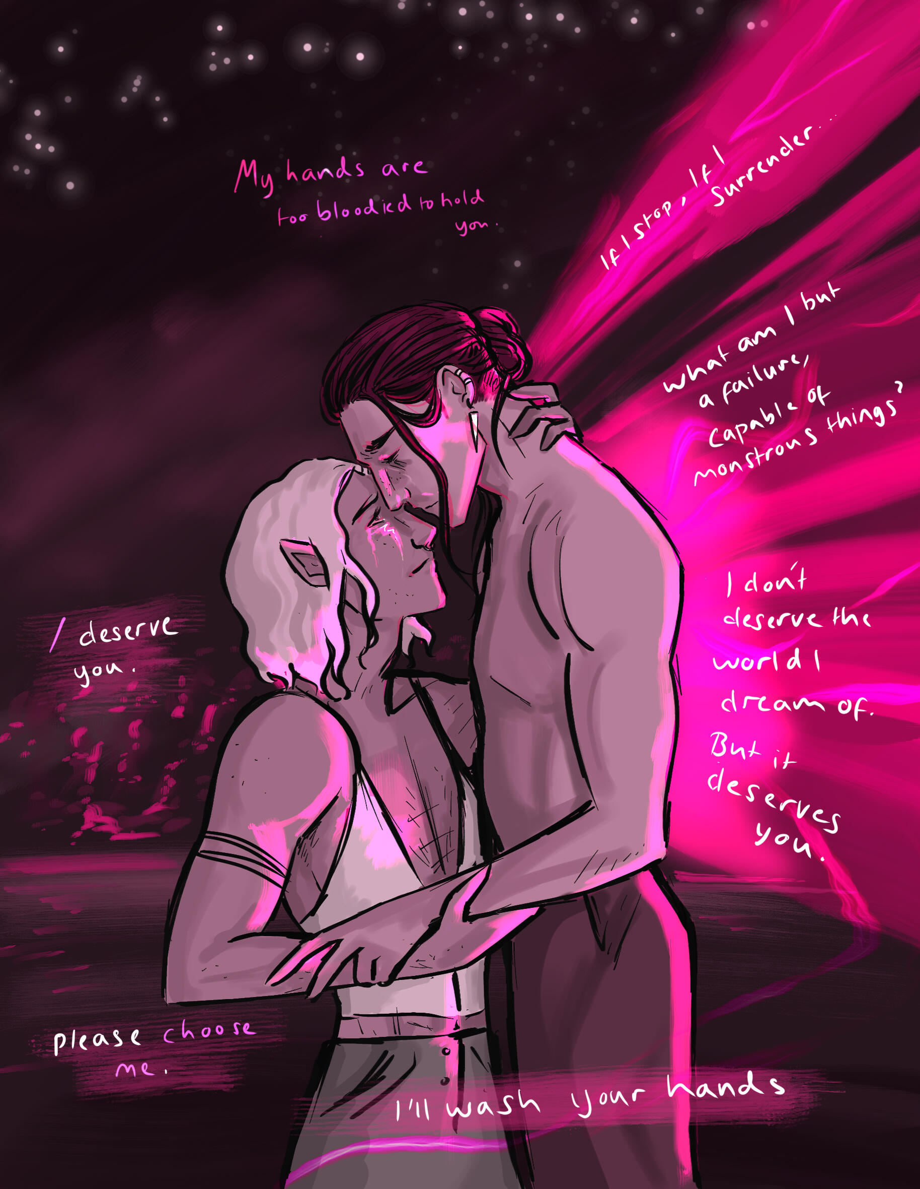 "....tell me, do you know the tale of the Raven Queen?"Wyll felt his heart beginning to sunder.He'd been blind; hadn't he? Or had he just not wanted to see it?"I see. Your loyal followers, fodder for the cost of equality," he said.His gut turned; a lick of rage in his stomach. How could he be so hypocritical? How could he claim freedom and equality? How could he? Couldn't he see?"... do you believe the shadar-kai would have chosen to become what they are if they knew that's what she had planned?"Augustine shook his head."They were not her plan - they are the remains of her half measure, her failure.""I will not fail - I don't intend to rule anything - if they fall with me, our deaths are the cost that had to be paid. Is it not better to die for freedom than to live in the shackles of injustice?"He took another step - reaching for Wyll - his expression turning from cold to imploring."If it could be only me, it would be, but I am not so naive to believe that this can be done without pain - to take from some to give back to all."Wyll had heard enough."Pain? Augustine - this is not pain. This is ... this is monstrous.""What becomes of us when you've done this? An equal world, or a ruined one?"One face was in his mind, above the others."...and what about Karlach - you're ... you're condeming her - don't you understand?"He reached for the hilt of his blade, his turn to make a final plea."My love, don't make me do this."