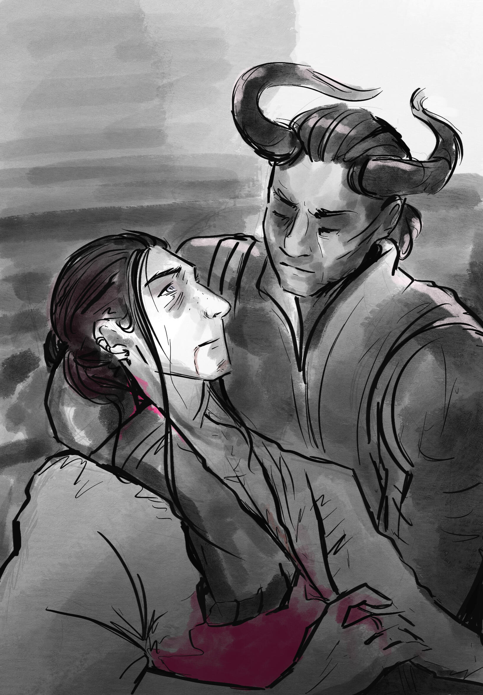 “I’ve always battled with the concept of fate, Boram,” he says, fixing her in his gaze.It’s been unflinching whenever he’s looked at her; he’s met the truth she can’t hide from him with his own, but in this moment, there is more - an unfamiliar expression in there that Boram knows.Doubt.“It’s a thing thrust upon us, handed to us - but I have never believed it had to be. Twice life has offered me a fate, and I have defied it to live. Not luck and chance. I saved myself.”“I might have died in that fire, collateral damage of my father’s sad, miserable life - just another sorry end for another boy born heir to nothing.”“I wasn’t as strong then as I am now; I thought I might die there, but I didn’t.”He gestures now to his back; to the designs that adorn his spine, that Boram knows he’s shared but a fraction of, though she hasn’t told him a word of the design that adorns her own - but they both recognise a mark for a mark.“When Gullistan Horne, that monster - that demon - that thing would have turned me to his weapon - when he scraped my mind from my skull to toy with it - I thought I might die again.”“You don’t know what sort of thing he was,” he said, “although I am sure you’ve encountered your own. Collecting and toying with whatever he chose, plucking their wings like insects, inventing his little tortures to please himself….”“It was my brilliance he was attracted to, he said,” Augustine purses his lips - a cloud crossing his features, dark and heavy, “my ‘fascinating broken brain’ - that it was sweeter to own something so hard to subdue.”“He wanted to make me a vessel. His vessel; a channel, to fill me with rot so I might be his avatar on the material plane. His puppet to do his little evils. Men born with power - they have such weak ambitions - they want such ugly things… you know this more than most, don’t you?”He closes his eyes.“It is my great shame, Boram, that I can’t tell you how I did it. I confess - it is my confession to you - that I don’t know how I broke his hold. I shouldn’t have been able to; but I did.”He opens his eyes, looking instead at his hands.“It’s no easy thing to kill an archfey, but they can die, and he did. I had no weapon. No blade. I killed him with my own hands. Pressed my fingers into his skull until I broke it and broke him.”He takes a breath.“Then I took the mark he’d given me,” he gestures to the symbol between his shoulder blades, “and I made it my own. I could turn his channel to much greater purpose,” he grazes his hand down his spine, “make his petty little ambition into something worthy. If I am to be a weapon it is to be a weapon that can do so much more.”He looks at her, gaze faltering.“When I made it back to this plane it had been over twenty years; my home was gone, my family forgotten as they ought to be, and nothing to return to. So I began the work; the work of gathering as many souls as I would need to create my blade. Heal the sick, bolster the weak, gather my followers on the path to endless truth.”“That is what this is,” he says, “this symbol is my channel - my weapon - through which I will have a blade that can cut through the fabric of reality itself. A blade that could sever our plane from the wheel; and render the material plane free at last, from those influences that would force their fates upon us.”His faltering gaze shakes.“I am walking towards another death Boram,” he says, “and if I stop walking then I will pay the cost for the steps I have already taken… and…”He looks away.“If I save myself this time, what will I become?”